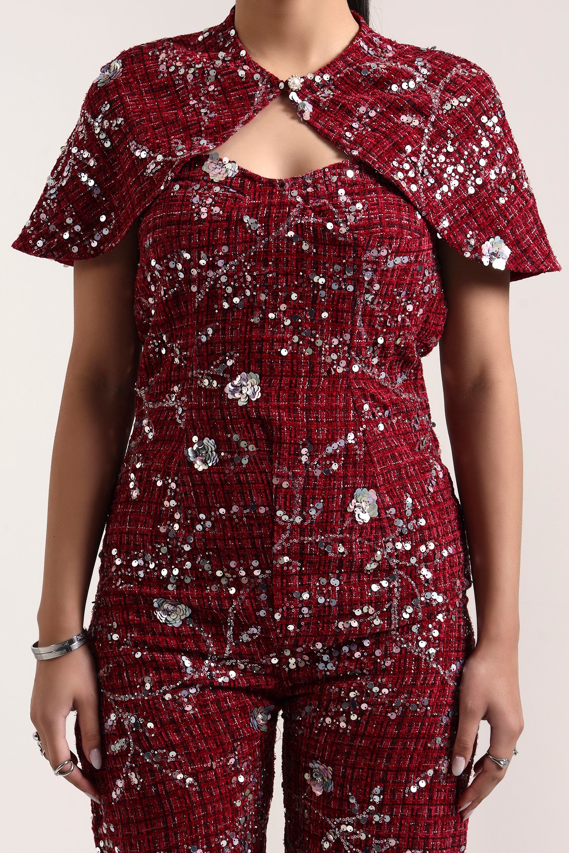 Sangria Embroidered Tweed Jumpsuit & Cape Set