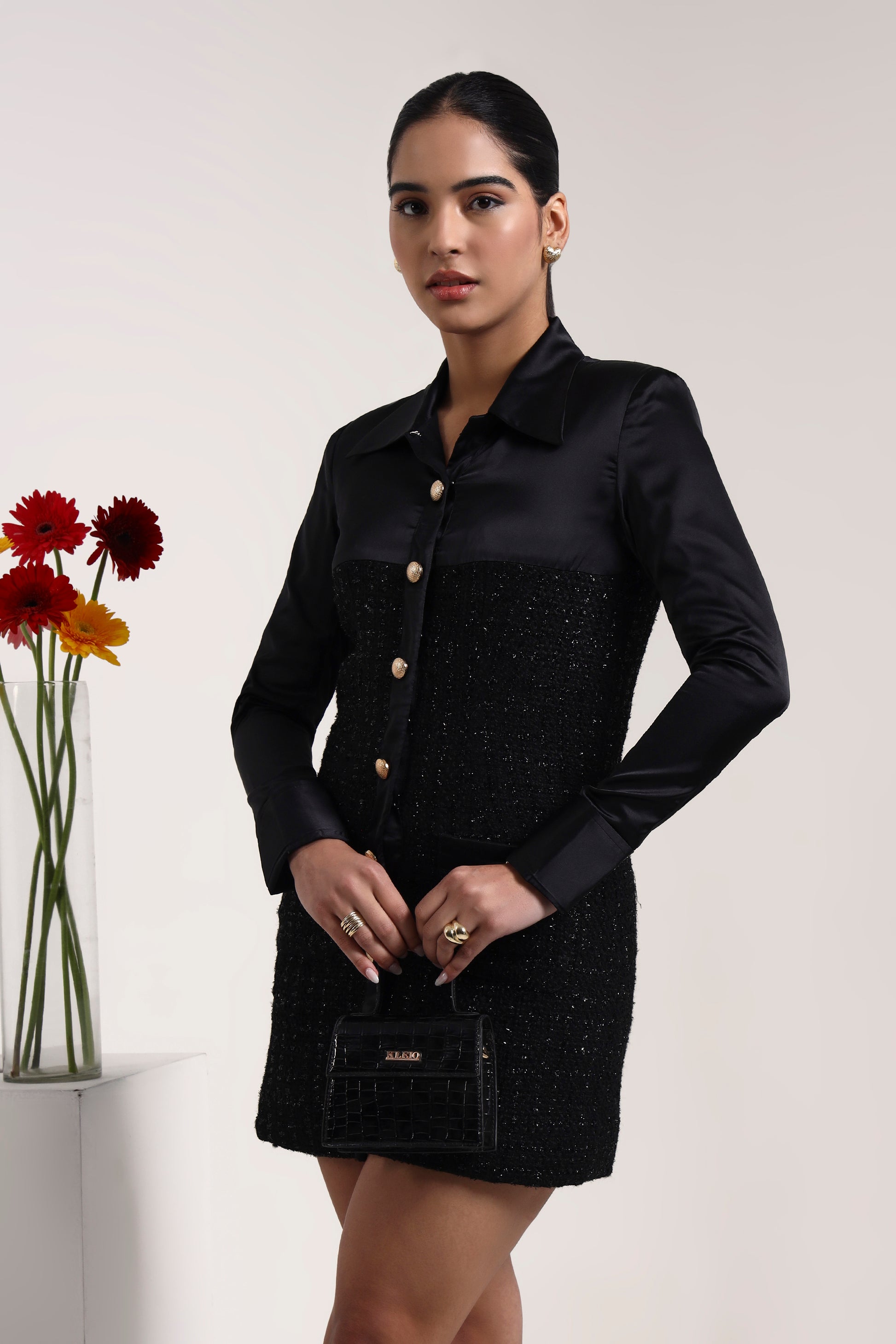 - Black Tweed Short Dress with a refined mixed-fabric design